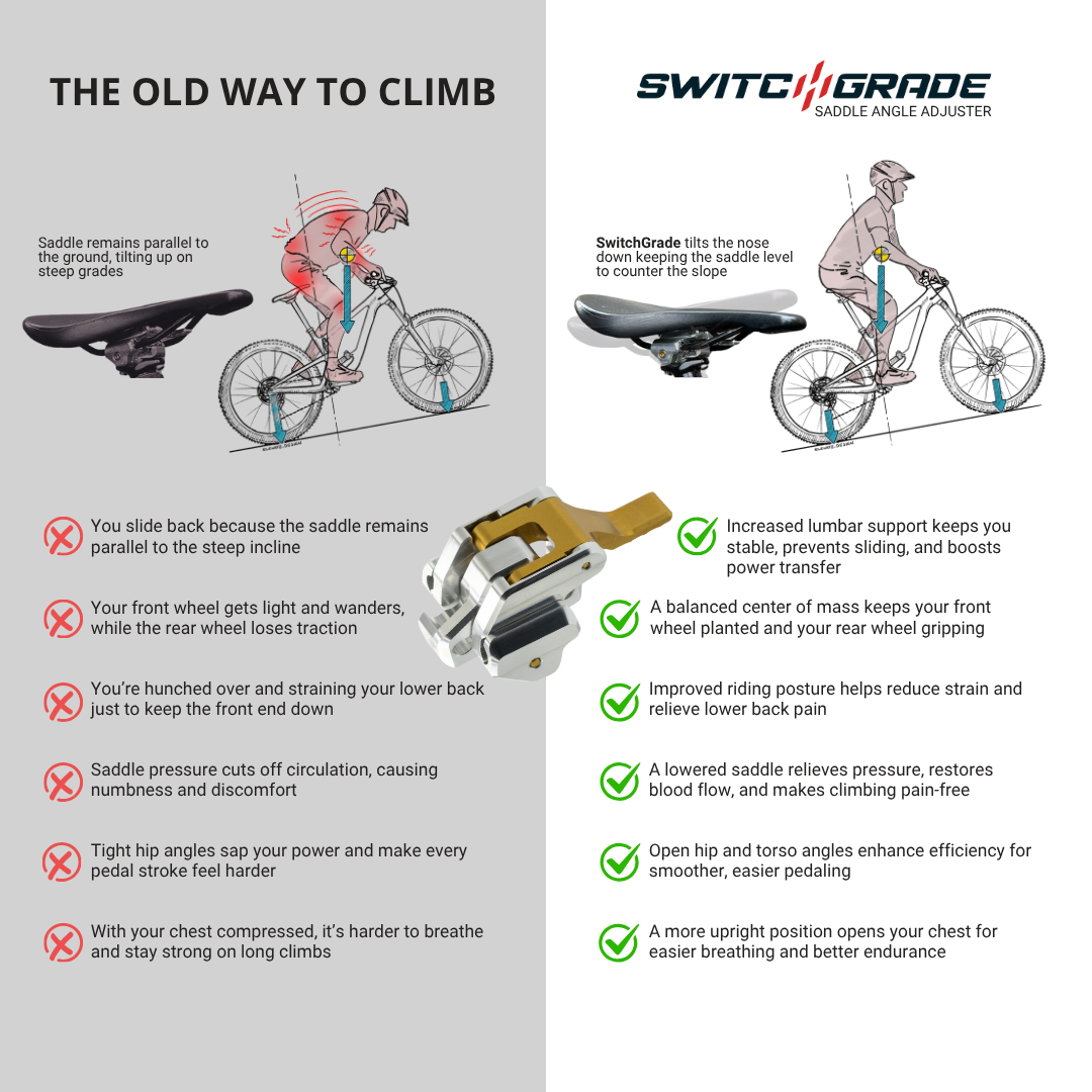 The SwitchGrade steepens your bike's effective seat tube angle and moves you forward over the bottom bracket. This balances your weight evenly between both wheels increasing traction, enabling smoother pedal strokes, relaxing your upper body, and improving breathing by opening up your diaphragm.